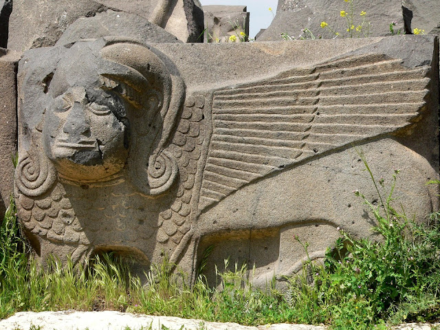 | A human faced animal with the body of a lion at Ain Dara, Syria. It has the horns of a Buffalo, the same as Maheesaura- the demon that Durga killed.  |